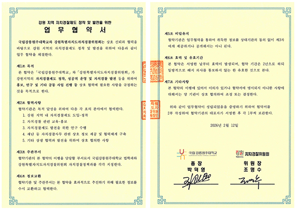 우리 대학은 2월 12일(목) 강원특별자치도자치경찰위원회와 강원 지역 자치경찰제도 정착 및 발전을 위한 업무협약을 체결했다.